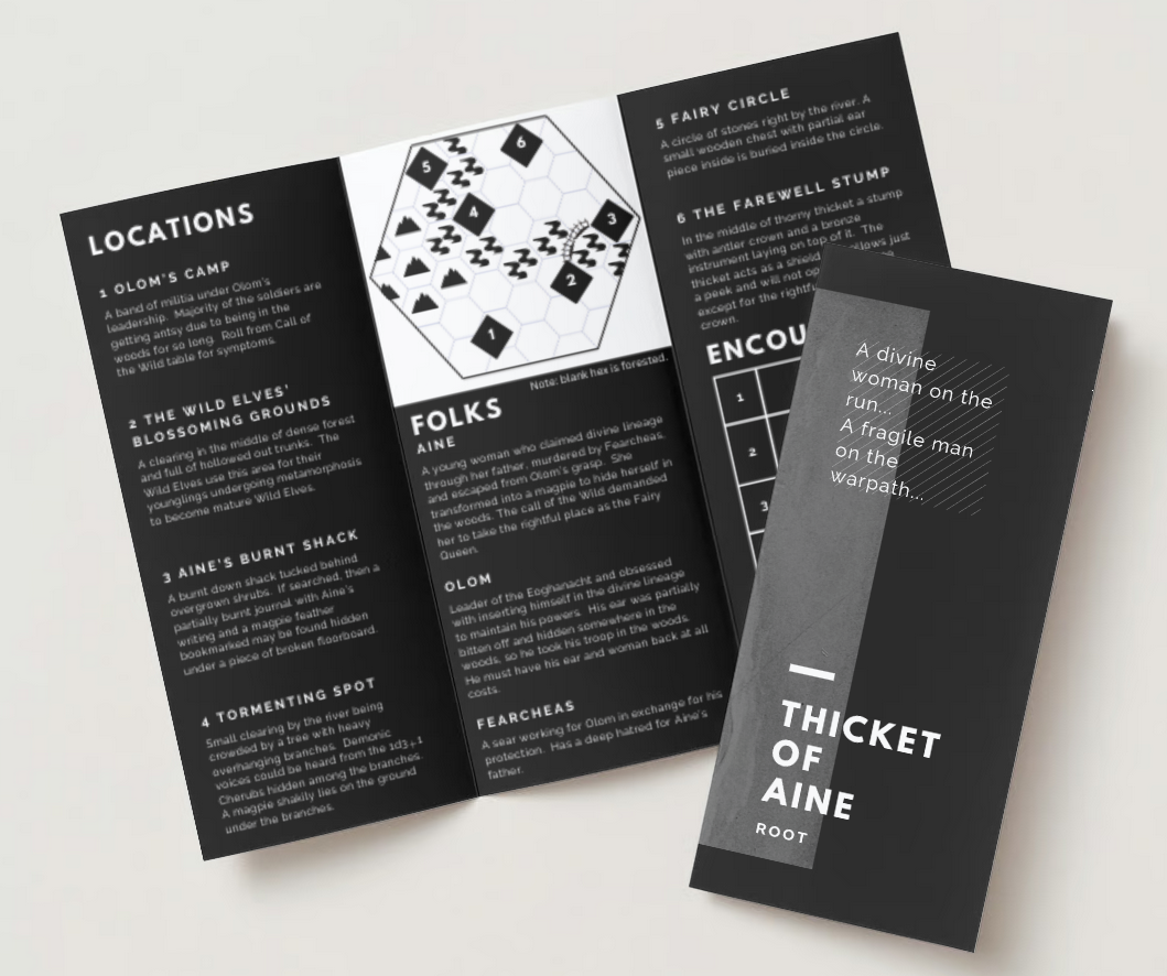 I had a lot of fun designing this adventure using the hex generating procedure in Into the Wyrd and Wild and working within the constraints of a tri-fold pamphlet layout. The story of Aine is kind of sad and I wanted to design the adventure with opportunity for Aine to have different potential endings compared to what happened in the original story. If you ever want to look into the story then you should be aware there are some mentions of sexual violence. I left that out of the adventure because I feel it's entirely up to the group if they're comfortable including that or not. The story can be created without that type of content with no problem so I don't see the need to include it.